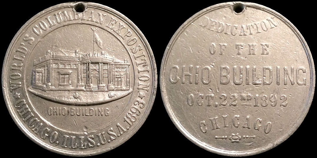 215) Building with flag within inner circle. World's Columbian Exposition around above. Chicago Ills. U.S.A. 1893 around below. Ohio Building below building in a straight line. Rv: Dedication Of The Ohio Building Oct. 22nd 1892 Chicago in five lines /// SH6-70. Very Rare, Aluminum / 35mm / Same obverse as HK216 / Always found holed? (IMAGE courtesy Bill Walter)