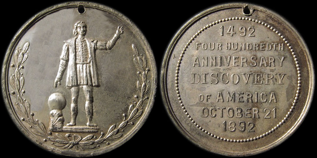 220) Columbus standing next to small globe with hand raised. Half wreath around. No inscription. Rv: Beaded circle. 1492 Four Hundredth Anniversary Discovery Of America October 21 1892 in seven lines /// SH6-39. Most are holed / Very Rare / Silver plate / 37.5mm (IMAGE)