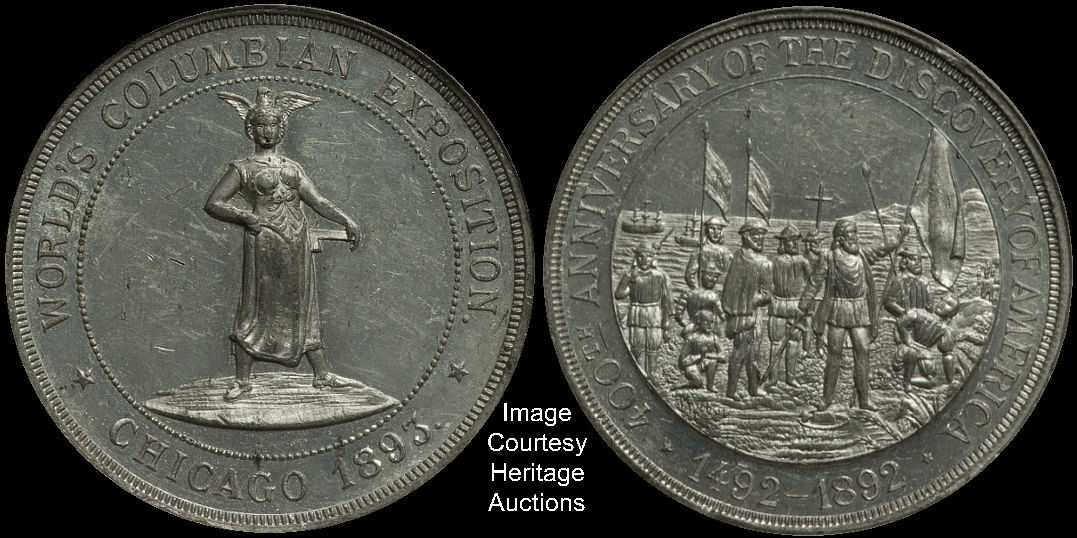 223) Standing statue of Columbia within inner beaded circle. World's Columbian Exposition around above. Chicago 1893 below. Rv: Columbus landing scene within center circle. 400th Anniversary Of The Discovery Of America 1492-1892 around /// From Heritage Auctions April 2020. This is the only one of these that I have seen. Extremely rare, White Metal. SH6-27 (IMAGE)