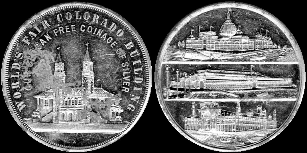 78) Corner view of building with central dome. Worlds Columbian Exposition around above. Administration Building around below. Rv: Building with two spires. World's Fair Colorado Building around above outside. Our Slogan Free Coinage of Silver around above inside. /// Very to extremely rare, Aluminum / 38 mm / SH6-147, HK210a in the second edition of HK (IMAGE)