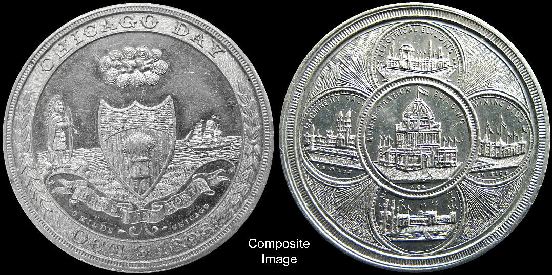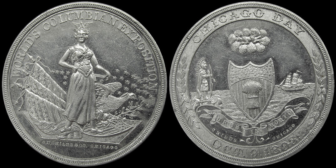 32) Chicago city shield in center. Sailing ship to the right. Standing Indian to the left. Nude child in cloud above. Urbs In Horto on scroll below. Chicago Day around outside above. Oct. 9, 1893 outside below. Rv: Standing female figure with flags, eagle, and small stars to the right. World's Columbian Exposition around above. S.D. Childs & Co. Chicago below in smalll lettering. /// Scarce, Aluminum / 36.5 mm / SH6-23, HK168, Eglit153 (IMAGE)