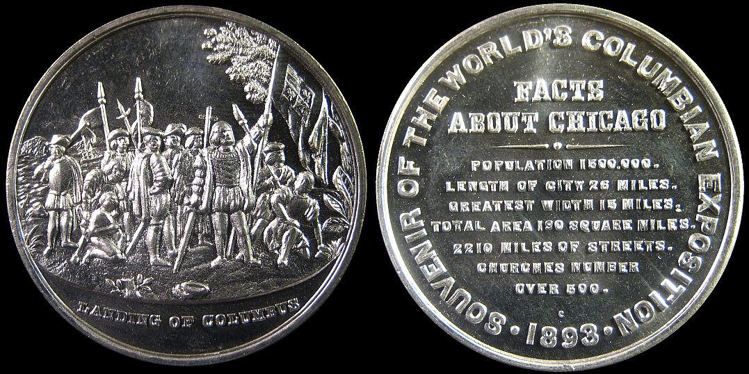 39) Scene with multiple figures depicting the landing of Columbus. Landing of Columbus below curve. Rv: Souvenir Of The World's Columbian Exposition 1893 around outside. Facts About Chicago above in two straight lines. Population 1500.000. Length Of City 26 Miles. Greatest Width 15 Miles. Total Area 190 Square Miles. 2210 Miles Of Streets. Churches Number Over 500. in seven lines. /// Common, Aluminum / 39.5 mm (measured) / SH6-34, HK169, Eglit18 (IMAGE)