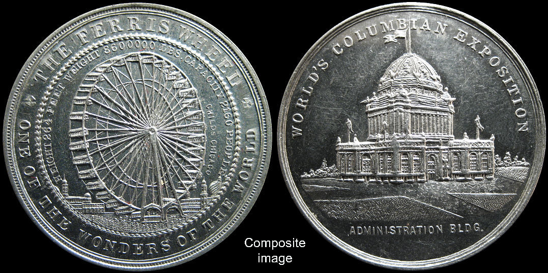 40) Building with dome. Worlds Columbian Exposition around above. Administration Building below in an arc. Rv: Ferris wheel. Greatest Mechanical Achievement Of The Age around above. Height 264 Feet Weight 4300 Tons Capacity 2160 People Engines 2000 Horsepower below in two curved lines. Ferris Wheel on ribbon above ferris wheel. /// Common, Aluminum / 44.7 mm (measured) / SH6-17, HK170, Eglit157 (IMAGE)