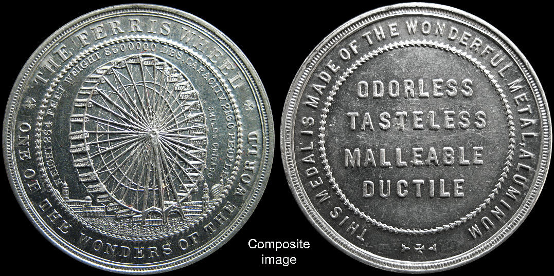 44) Ferris wheel. The Ferris Wheel above. One Of The Wonders Of The World around below. Height 264 Feet Weight 8600000 lbs. Capacity 2160 People around above within inner circle. Childs Chicago next to Ferris wheel to the right. Rv: This Medal Is Made Of The Wonderful Metal, Aluminum around outside. Odorless Tasteless Malleable Ductile within center circle in four straight lines. /// Extremely rare, Aluminum / 38 mm / The obverse of HK171 combined with the reverse of Eglit464. The only example of this die combination that I found was from Charles Kirtley sale #60 lot#C529 (with no image), described as "H&K 171 Obverse. Wonderful Aluminum reverse. EF-45.". The reverse of HK159 and HK159a also use "wonderful metal" in their inscriptions, but those dies are smaller than the obverse HK171 Ferris wheel die. Until I see an actual example of this die combination, I will have to assume that the Charles Kirtley auction description was correct. (IMAGE)