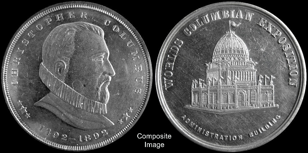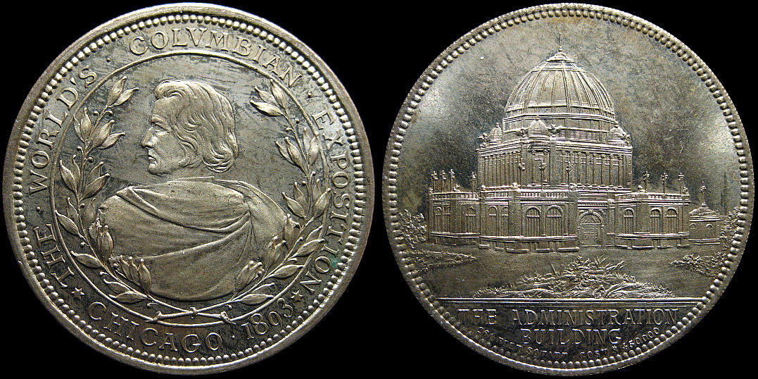 49) Columbus facing left within open wreath. The World's Columbian Exposition around above. Chicago 1893 below. Rv: Building with dome. The Administration Building below. 260 Feet Square Cost $450,000 below in small print. / Very scarce in Brass and Aluminum with Brass being slightly more common. Rare in Silver Plate. Extremely rare in Copper if in fact it exists at all. Be careful of worn pieces described as Bronze or Copper that could in fact be Brass. / 35.6 mm with all probably having a reeded edge / SH6-83, HK176, HK177, Eglit118 (IMAGE)