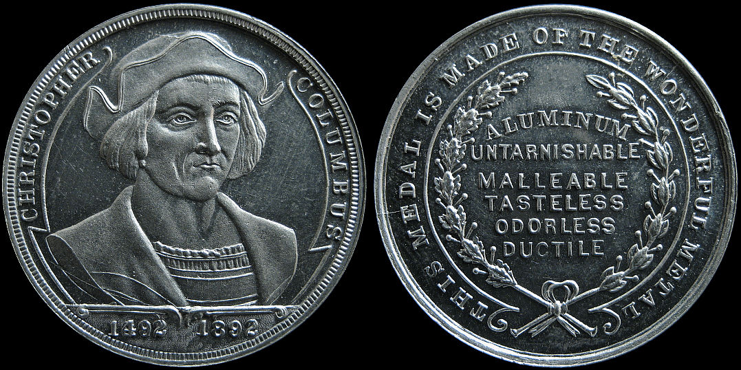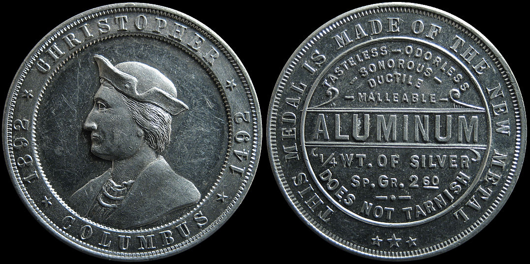 8) Bust slightly right with hat within inner circle. Christopher Columbus around above. 1492-1892 below. Rv: Three stars below. This Medal Is Made Of The New Metal around outside. ALUMINUM in the middle between two lines. Tasteless-Odorless-Sonorous-Ductile-Malleable above within inner circle. 1/4 Wt. Of Silver Sp. Gr. 260 Does Not Tarnish below within inner circle. /// Very rare die pairing / Aluminum / 35 mm / Obverse HK227 combined with the reverse of HK160. SH6-138 (IMAGE)