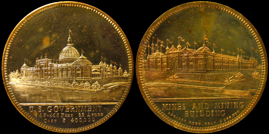 53) Elaborate building with many flags. Mines and Mining Building below, 500 X 700 Feet Cost $265,000 in small print. Rv: Building with central dome and multiple flags. U.S. Government 345 X415 Feet 3.3 Acres Cost $400,000 below in three lines. /// Very scarce in Aluminum. Rare in Brass. Extremely rare in Silver Plate. Extremely rare in Copper if in fact it exists at all. Be careful of worn pieces described as Bronze or Copper that could in fact be Brass. / Aluminum pieces probably all measure 35.6 mm with a reeded edge. Brass and Silver Plate pieces may all measure 35.3 mm with a plain edge. / SH6-98, HK183a, HK183b (IMAGE)