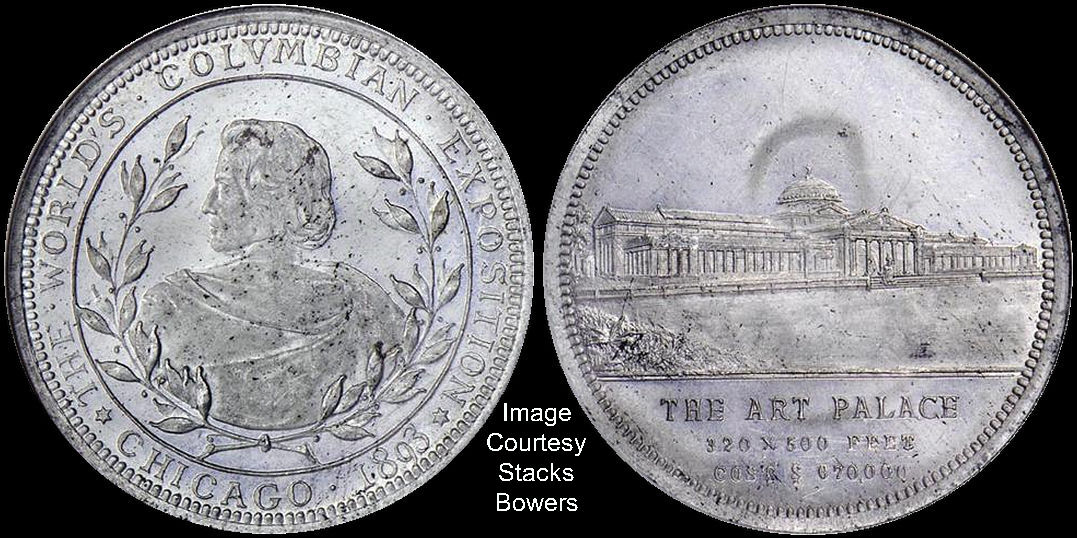 58) Columbus facing left within open wreath. The World's Columbian Exposition around above. Chicago 1893 below. Rv: Large long building. The Art Palace 320 X 500 Feet Cost $670,000 below in three lines. /// Very scarce in Brass and Aluminum with Brass being slightly more common. Very rare in Silver Plate. Extremely rare in Copper if in fact it exists at all. Be careful of worn pieces described as Bronze or Copper that could in fact be Brass. / 35.6 mm with all probably having a reeded edge. / SH6-90, HK184, HK185, Eglit121 (IMAGE)