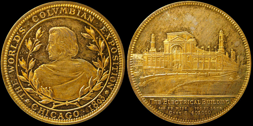 61) Columbus facing left within open wreath. The World's Columbian Exposition around above. Chicago 1893 below. Rv: Building with large central entrance and tall spires at corners. The Electrical Building 345 Ft. Wide 700 Ft. Long Cost $401,000 below in three lines. /// Very scarce in Brass and Aluminum with Brass being slightly more common. Rare in Silver Plate. Extremely rare in Copper. / 35.6 mm with all probably having a reeded edge. / SH6-84, HK188, HK188a, HK189, Eglit126 (IMAGE)