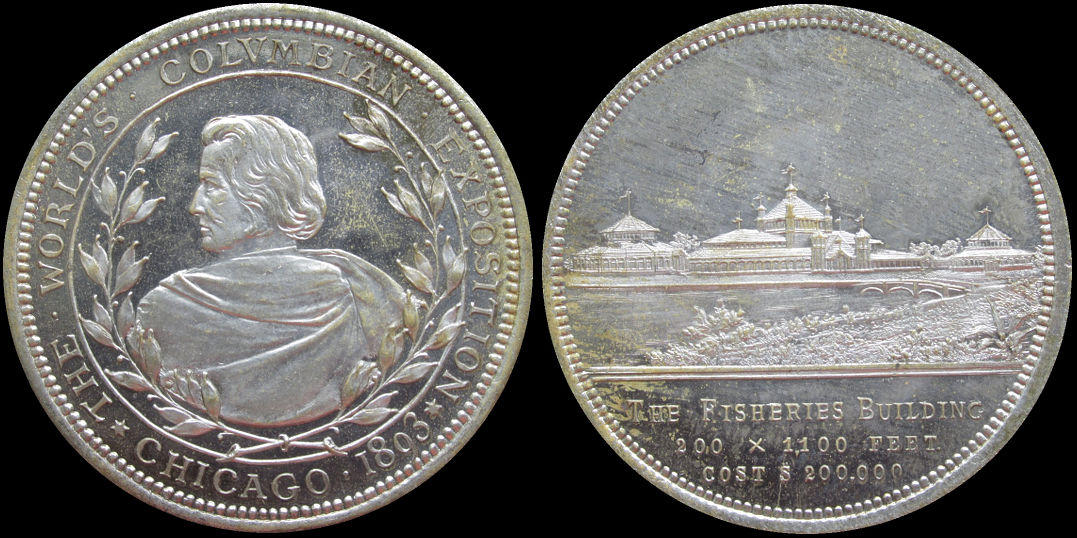64) Columbus facing left within open wreath. The World's Columbian Exposition around above. Chicago 1893 below. Rv: View of buildings with flags. The Fisheries Building 200 X 1,100 Feet Cost $200,000 below in three lines. /// Very scarce in Brass and Aluminum with Brass being slightly more common. Rare in Silver Plate. Extremely rare in Copper if in fact it exists at all. Be careful of worn pieces described as Bronze or Copper that could in fact be Brass. / 35.6 mm with all probably having a reeded edge. / SH6-94, HK193, HK194, HK195, Eglit127 (IMAGE)