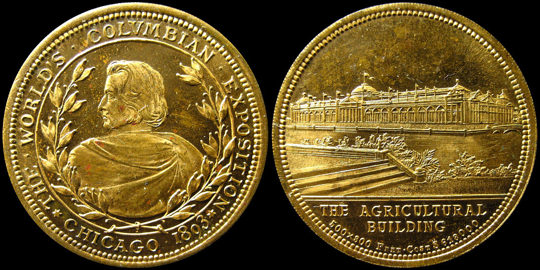 65) Columbus facing left within open wreath. The World's Columbian Exposition around above. Chicago 1893 below. Rv: Large long building with flags. The Agricultural Building 500 X 800 Feet Cost $618,000 below in three lines. /// Very scarce in Brass and Aluminum with Brass being slightly more common. Rare in Silver Plate. Extremely rare in Copper if in fact it exists at all. Be careful of worn pieces described as Bronze or Copper that could in fact be Brass. / 35.6 mm with all probably having a reeded edge. / SH6-91, HK196, HK196a, HK197, Eglit122 (IMAGE)