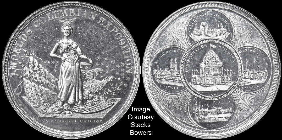19) Domed building within inner circle. Twelve stars around above building. Souvenir. Birdseye View Of The Worlds Fair Chicago around outside. 1893 below. Blumenfield P.O.C. around below in tiny lettering within inner circle Rv: Landing scene with five figures. Souvenir Of The Opening Of The Worlds Fair Chicago around outside. 1893 below. /// Common in Aluminum, scarce in White Metal / 39.7 mm / SH6-32, HK165, HK166, Eglit21 (IMAGE)