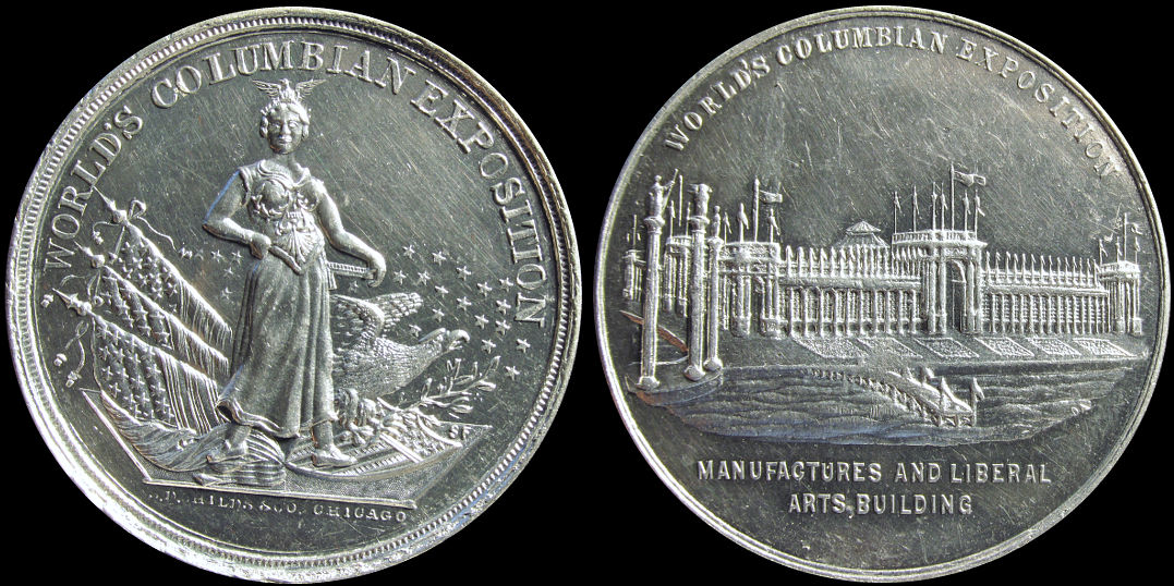 67) Columbus facing left within open wreath. The World's Columbian Exposition around above. Chicago 1893 below. Rv: Building and ship within ornamental borders above. One long rectangular building below. Casino And Music Hall upper left. Imitation Battle Ship upper right. Manufactures and Liberal Arts below lower building. 787 X 1687 Feet 51 Acres Cost $1,500,000 below in small lettering. /// Very scarce in Brass and Aluminum with Brass being slightly more common. Very rare in Silver Plate. Extremely rare in Copper if in fact it exists at all. Be careful of worn pieces described as Bronze or Copper that could in fact be Brass. / 35.6 mm with all probably having a reeded edge. / SH6-86, HK200, HK201, HK201a, HK202, Eglit119 (IMAGE)