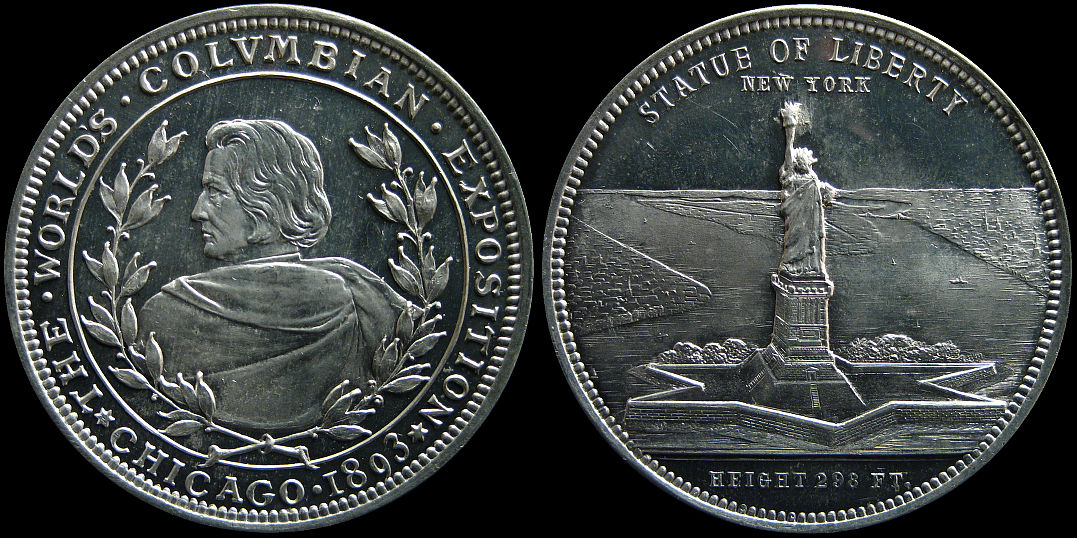 72) Columbus facing left within open wreath. The World's Columbian Exposition around above. Chicago 1893 below. Rv: Statue and New York harbor. Statue Of Liberty New York above in one curved line and one straight line. Height 298 Ft. in exergue below. /// This piece comes in three different die varieties using two different obverse dies and two different reverse dies. / Found in various medals. All metals together, Rare / Aluminum, Brass(Gilt?), and Silver Plate-each rare to very rare. Extremely rare in Copper / 35.3 - 35.7 mm and found with a reeded edge or a plain edge. SH6-103, HK207, HK207a, HKHK208, Eglit295 (IMAGE)