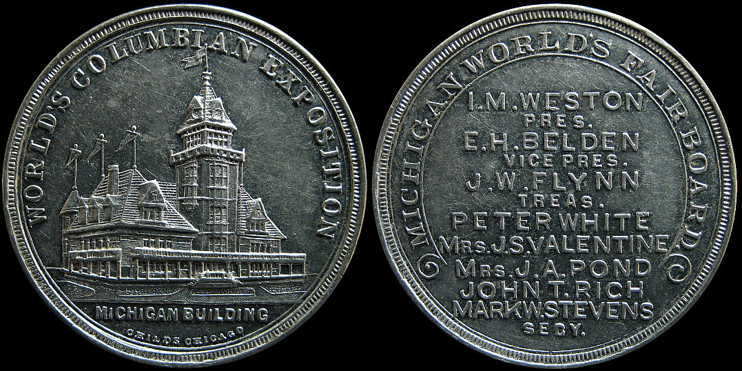 82) Building with flags. World's Columbian Exposition around above. Michigan Building below building. Childs Chicago around below in small lettering. Rv: Michigan Worlds Fair Board above around. I.M. Weston Pres. E.H. Belden Vice Pres. J.W. Flynn Treas. Peter White Mrs. J.S. Valentine Mrs. J.A. Pond John T. Rich Mark W. Stevens Secy. in twelve lines. /// Scarce, Aluminum / 38.1 mm (measured) / SH6-64, HK214, Eglit219 (IMAGE)