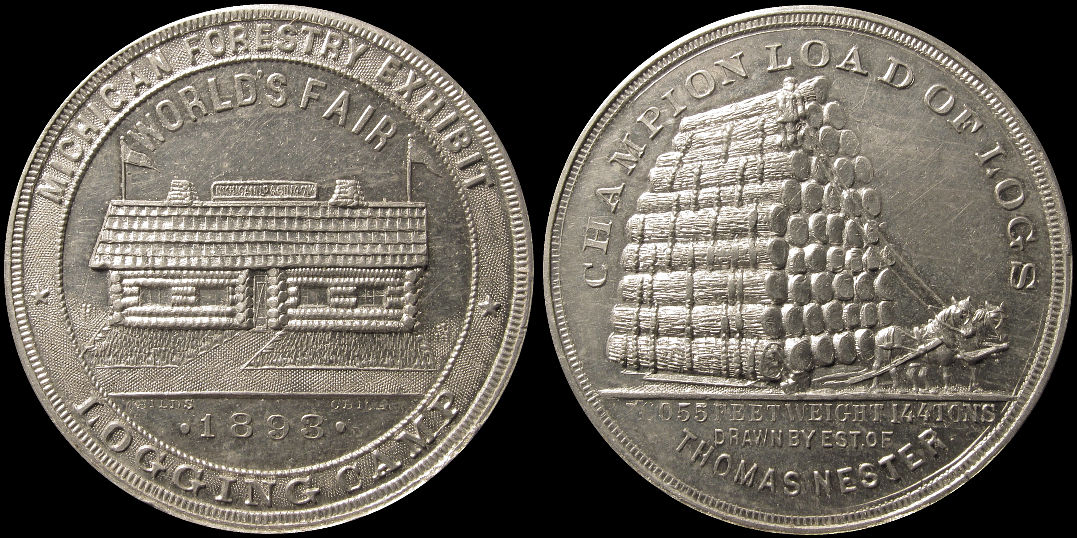 85) Log cabin within inner circle. Michigan Forestry Exhibit around outside above. Logging Camp around outside below. Worlds Fair around above within inner circle. 1893 below. Childs Chicago to the left and right below cabin in tiny lettering. Rv: Large load of logs being pulled by horses. Champion Load of Logs around above. 36055 Feet Weight 144 tons Drawn By Est. Of Thomas Nester below. /// Very scarce, Aluminum / 38.3 mm (measured) / SH6-68, HK215, Eglit220, Rulau Chi 108 (IMAGE)