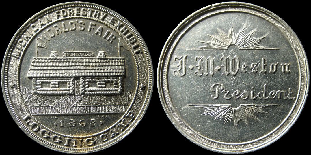 86) Log cabin within inner circle. Michigan Forestry Exhibit around outside above. Logging Camp around outside below. Worlds Fair around above within inner circle. 1893 below. Childs Chicago to the left and right below cabin in tiny lettering. Rv: Sunbursts above and below name. J.M. Weston President. in two straight lines. /// Very rare and considerably rarer than HK215 / Aluminum / 38.2 mm (measured) / SH6-67, Obverse of HK215 combined with a different reverse. (IMAGE)
