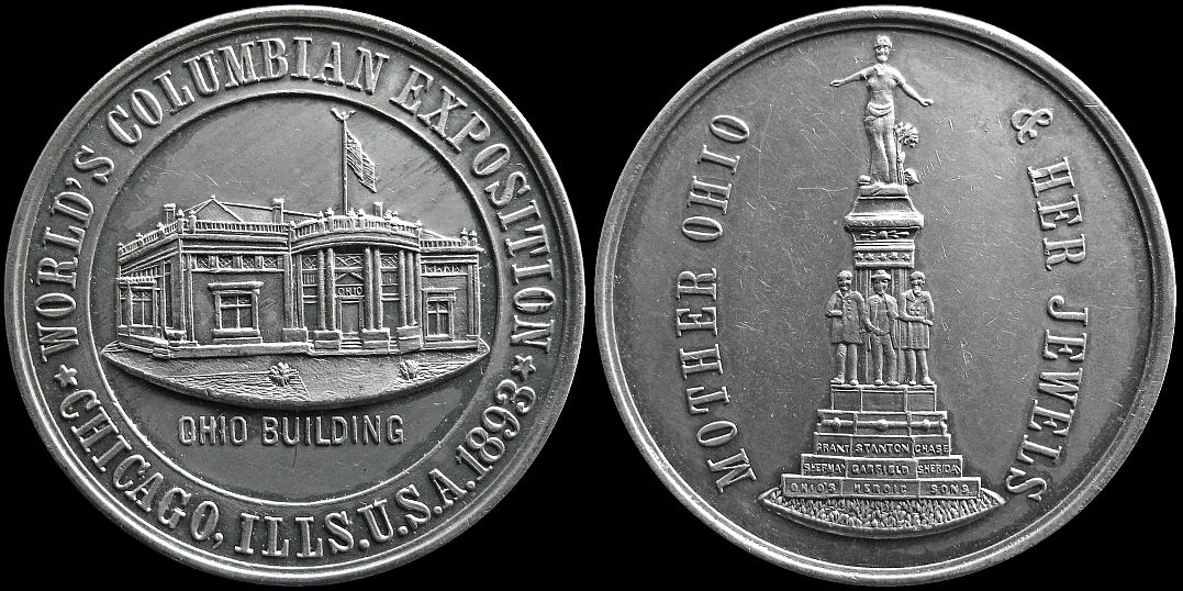 89) World globe within inner circle with Chicago marked on the left side of the globe. World's Columbian Exposition around above. Chicago, Ills. 1893 around below. Rv: Monument with figure on top. Mother Ohio & Her Jewels to the left and right. Grant Stanton Chase Sherman Garfield Sheridan Ohio's Heroic Sons on base of monument. /// SH6-75. Extremely rare, Brass / 35 mm / Obverse of HK219 combined with the reverse of HK216. From Presidential Coin and Antique sale #55 lot#1121
