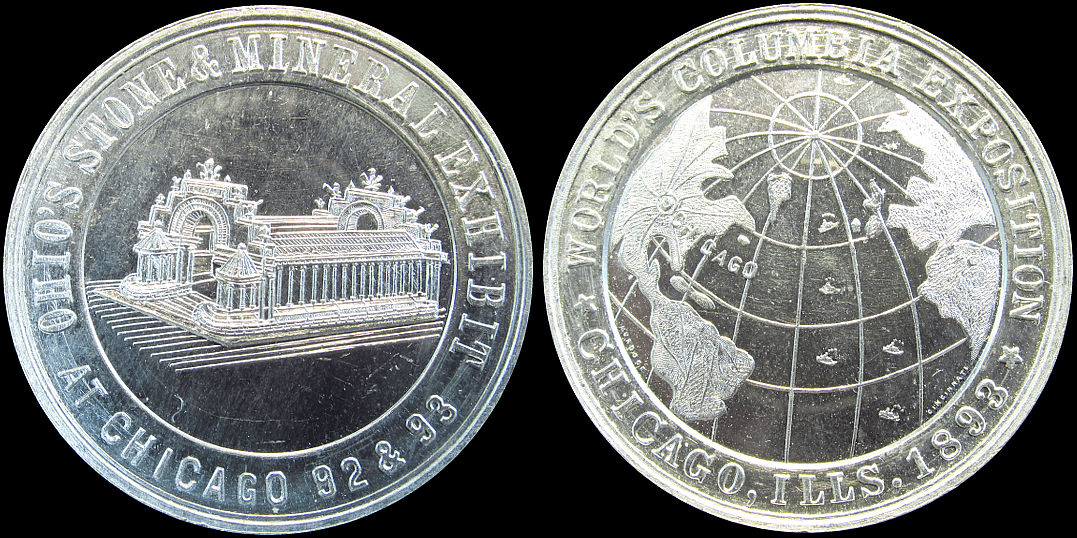 91) World globe within inner circle with Chicago marked on the left side of the globe. World's Columbian Exposition around above. Chicago, Ills. 1893 around below. Rv: Building in center circle. Ohio's Stone & Mineral Exhibit around above. At Chicago 92 & 93 around below. /// Scarce, Aluminum / 35.1 mm / SH6-73, HK219, Eglit441 (IMAGE)