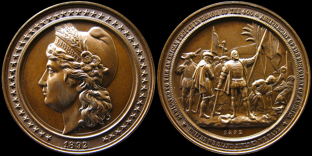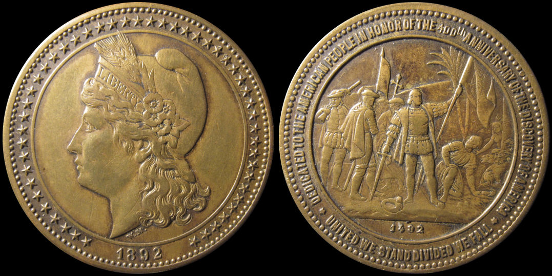 93) Liberty head left in high relief. Stars around in outer circle. 1892 below. Small W.M. below bust. Rv: Columbus landing scene with multiple figures. Dedicated To The American People In Honor Of The 400th Anniversary Of The Discovery Of America around above. United We Stand Divided We Fall below. 1492 inside inner circle below. /// Scarce in Aluminum. Very scarce in Bronze. Rare in Gilt. Also known in extremely rare White Metal and Silver. Attractive and popular. / 35.8 mm / SH6-79, HK220, HK221, HK222, Eglit51, Eglit51a (IMAGE)