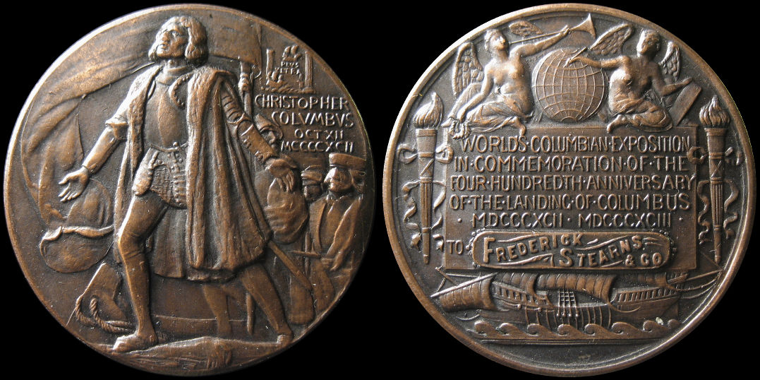 98) Standing figure with arms held out from side, Christopher Colvmbvs Oct XII MCCCCXCII at upper right. Rv: Central rectangle between two torches. Globe and two figures above. Worlds Columbian Exposition In Commemoration Of The Four Hundredth Anniversary Of The Landing Of Columbus MDCCCXCII MDCCCXCIII within rectangle. To Frederick Stearns & Co within lower part of rectangle. /// SH6-7.3. Very to Extremely rare variety of HK223 / Copper / 38.4 mm (measured) / Obverse HK223 with different name on reverse. (IMAGE)