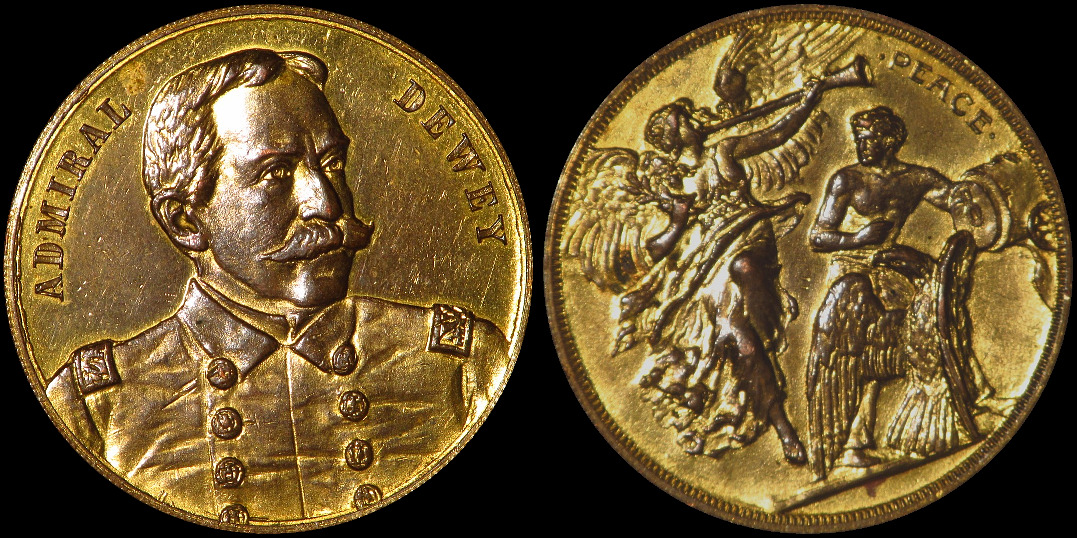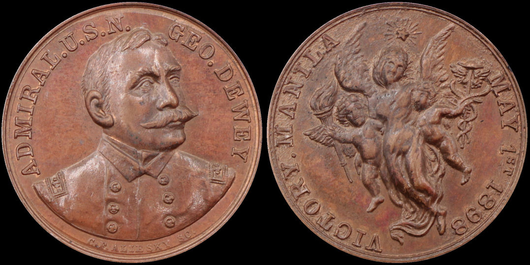 277a) 1898 Admiral Dewey Manila Victory medal. Signed "C.F. Aliesky SC." around bottom obverse. I have seen this piece described as brass, bronze and aluminum, none of which are common. Combining all three metals together, strongly Rare. Bob Slawsky Auction #58 lot#304 for one described as brass. Charles Kirtley sale #11 lot#447 for one in aluminum. All that I found were un-holed, and probably un-looped. Bronze, 33mm. Image courtesy of Vermont Historical Society |
