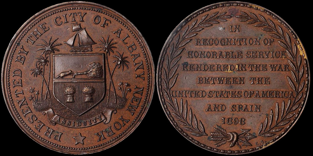 295b) 1898 Military service medal issued by the City of Albany. "In Recognition of Honorable Service Rendered in the War Between the United States Of America and Spain 1898". Found in bronze, white metal, aluminum, and gold, usually with a clamped on loop. Rare in bronze, white metal or aluminum, and Extremely Rare in gold. 38mm. Image Courtesy of Stack’s Bowers Galleries www.stacksbowers.com |