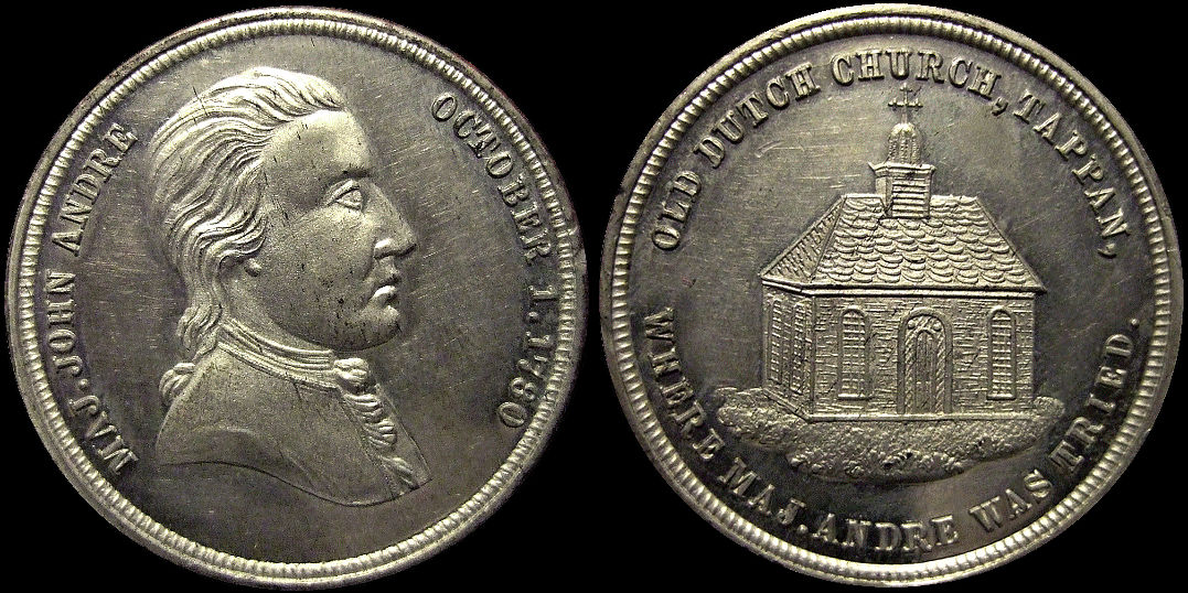 275a) Medal depicting the Old Dutch Church, where John Andre was tried. By George Lovett. Found in bronze, white metal and silver. Rare in bronze. Very Rare in white metal. Extremely Rare in silver. 34.2mm. Image courtesy of Dave Baldwin at Lovett Tokens and Medals. |