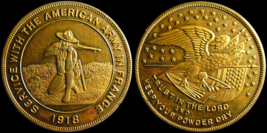 300) "Service With The American Army In France / 1918". Has been designated as HK-894B by NGC. Found in bronze, brass, and occasionally silver plate. Rare combining all three together. Brass, 36mm. Find AMERICAN ARMY IN FRANCE medals on ebay |