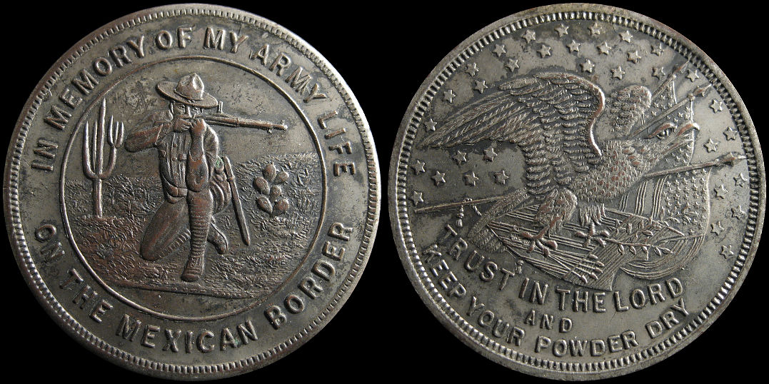 296) This and the following eight pieces have the same or similar reverses as HK892. The first four all relate to America's uneasy relationship with Mexico, during the Mexican revolution. The one shown here has been designated by NGC as HK-894D. It is most commonly found in bronze, but also found in silver plate and brass(gilt?). "In Memory Of My Life On The Mexican Border". Combining the bronze and two plated varieties together, Very Scarce bordering on Rare. Silver plated bronze, 36mm. Look for MEXICAN BORDER medals on ebay |
