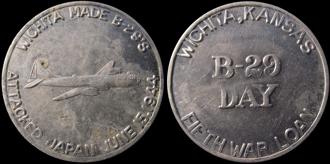 289) A souvenir token from B-29 Day at the Boeing plant in Wichita, Kansas 1944. "Wichita, Kansas Fifth War Loan / B-29 Day". The token makes reference to the June 15, 1944 invasion of Saipan which would give U.S. forces an airbase from which they could launch B-29 air attacks against Japan. Rare. Aluminum, 41.4mm. |