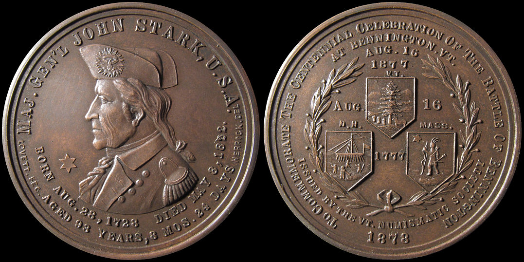 273) I have found this piece described as silver, silveroid(45% nickel, 54%copper, 1% manganese), bronze and white metal. Look at Presidential Coin and Antique Co. #51 lots #105 and #106 for silver and silveroid examples. Rare in white metal, Very Rare in bronze. Extremely Rare in silver or silveroid. Almost always found without a hole in all metals. Signed by George Lovett, "Lovett, FEC.". Bronze, 39.7mm. Find BATTLE OF BENNINGTON COINS and MEDALS on ebay |
