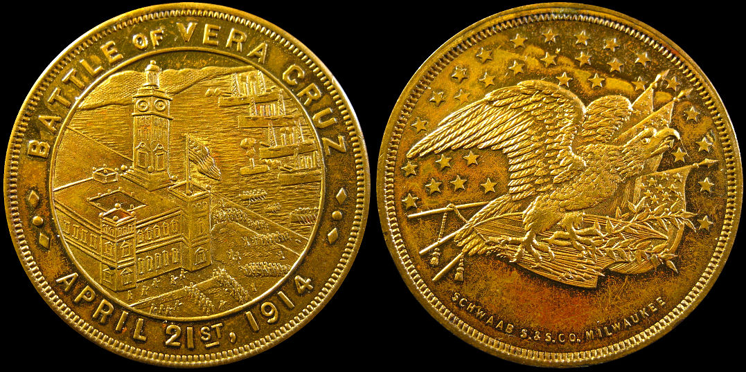 298) "Battle Of Vera Cruz / April 21st, 1914". The usual reverse wording is replaced by "Schwaab S. & S. Co. Milwaukee". The reverse device is also somewhat different. This variety appears to be somewhat more common than some of the others. Very Scarce. Brass, 35.9mm |
