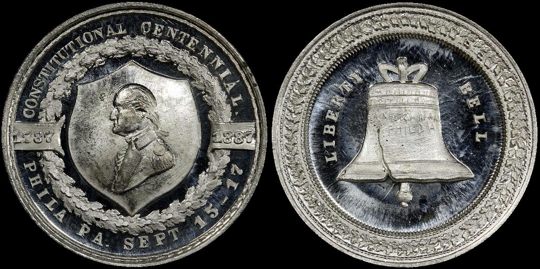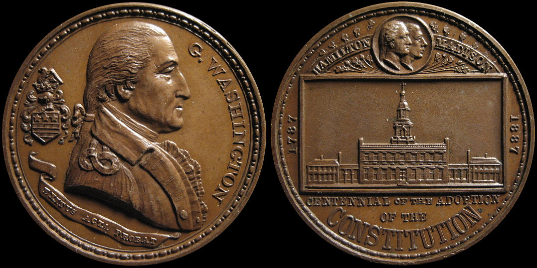 268) Commemorating the centennial of the adoption of the U.S. Constitution. Baker-1800 and Baker-1800A. Very Scarce in white metal, but Very Rare in nicer Unc in white metal. Approx. 60% are holed in white metal and sometimes found with top eagle pin attachment. Rare to Very Rare in bronze, and usually found in nice condition as such and never(?) holed. Bronze, 37.7mm. |