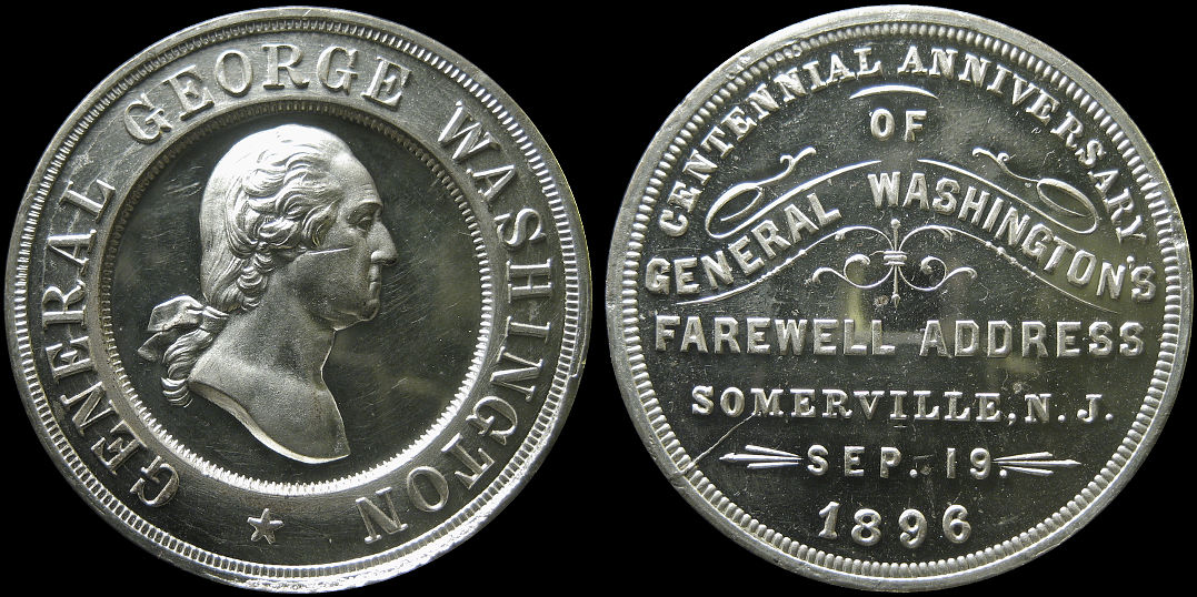 270)Centennial Anniversary of General Washington's Farewell Address. I bought this piece and another in bronze at Presidential sale #78, June 2008 lots #1018 and #1019. Read Presidential Coin and Antique Co #45 lot#726 for a second piece in white metal. Note the reverse die crack extending out to the rim at 8:00. Not in Baker(Rulau/Fuld). Very Rare bordering on Extremely Rare in white metal. Extremely Rare in bronze. White metal, 37.8mm |