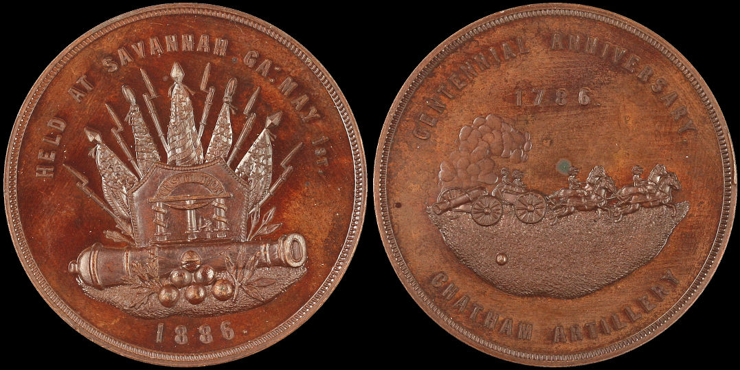 266c) Chatham Artillery Centennial Anniversary 1786 1886 held at Savannah Georgia May 1st 1886. Found in both bronze and white metal and very rare in either metal. In white metal they are often holed. Bronze, 38mm. Images courtesy Randy Dobler |