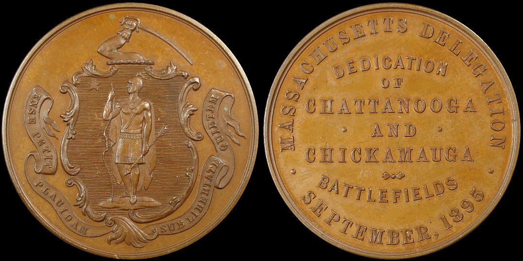 275f) Massachusetts Delegation dedication of the Chattanooga and Chickamauga battlefields in Fort Oglethorpe, Georgia September 1895. Very Rare, possibly Extremely Rare. Look at Johnson & Jensen sale September 16, 1979 lot #634 for an example. The description in the auction catalog states: "Probably struck at U.S. Mint. Storer 1269". Bronze, 39mm. Image courtesy Jonathan Brecher. |