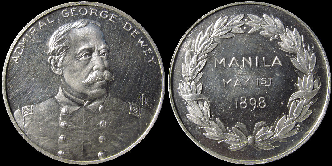 276) Medal of Admiral George Dewey and the Battle of Manila Bay. Small "HR" monogram above Dewey's right shoulder. There is also a second variety of this medal that lacks the "HR" initials, and with a different style of lettering. Both appear to be Rare. The variety without the HR monogram might be an older(original?) variety, and is sometimes found holed. The other possibly newer variety shown here is almost never found with a hole. Aluminum, 37.9mm. Find ADMIRAL GEORGE DEWEY COLLECTIBLES on ebay |