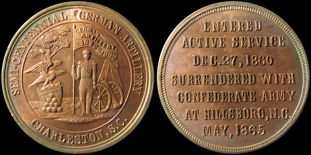 272) A military commemorative of the "Semi-Centennial German Artillary Charleston, S.C." I have only found it in copper. Very Rare. Copper, 38.6mm |