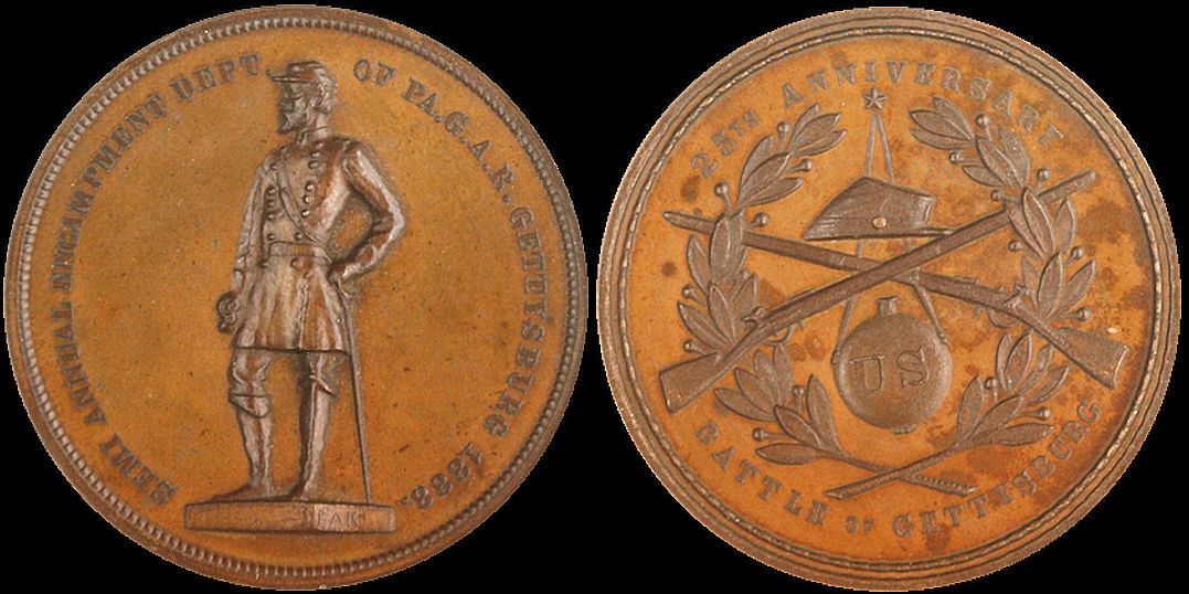 275d) A fraternal medal commemorating the 25th Anniversary of the Battle of Gettysburg. Also commemorating an 1888 semi-annual encampment of the GAR. Very Rare in White Metal and sometimes holed. Extremely Rare in Bronze, 38mm. From the collection of Randy Dobler. |