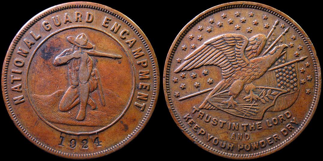 301) This and the following three pieces are all "National Guard Encampment" souvenirs with different dates. This one is dated 1920. Has been designated as HK-894G by NGC. Others are dated 1921, 1923, 1924(look below). I have never seen a 1922 dated piece, if they exist at all. Altogether, they appear to be Rare, but individually they are all rarer than most of the other varieties. Note that the reverse device has slight differences from the other varieties above. Dated 1920. Very Rare, Brass, 36mm. Look for NATIONAL GUARD ENCAMPMENT medals on ebay |