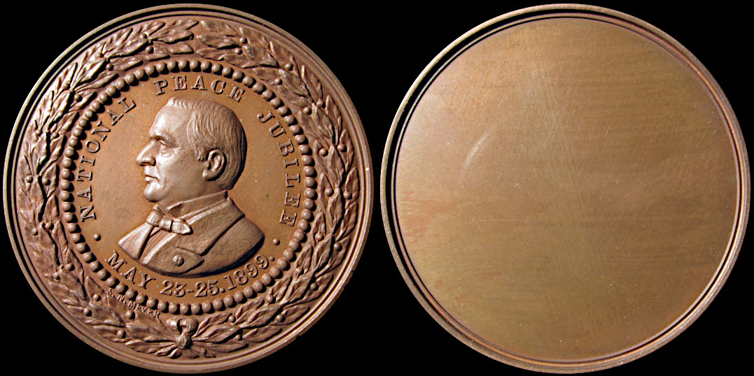 282c) Uniface McKinley National Peace Jubilee medal May 23-25. 1899. This medal is usually found with a clamped on loop with hanger. Very Rare, Bronze, 44.6mm. Click HERE for an example sold at Stacks evidently given to Teddy Roosevelt. |
