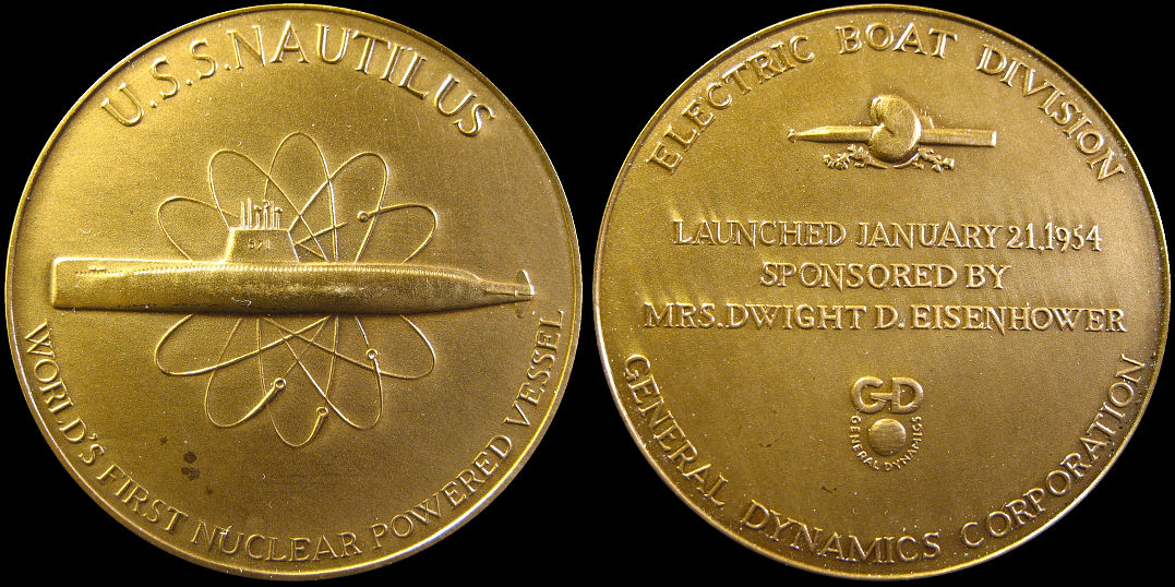 293) Commemorating the launching of the "U.S.S. Nautilus / World's First Nuclear Powered Vessel". This piece sometimes comes with a cardboard insert. Very Scarce. Yellow bronze, 39.3mm. |