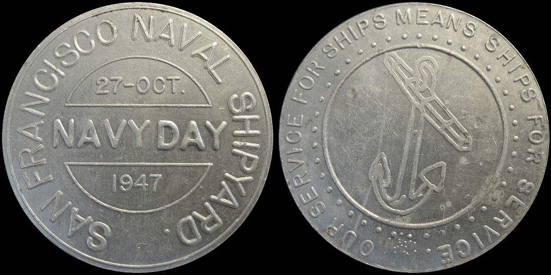 292)"San Francisco Shipyard Naval Shipyard / 27-Oct. Navy Day 1947". Very Scarce. thin aluminum, 38.1mm |