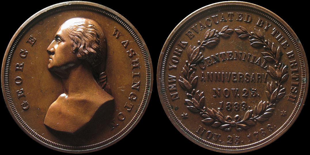 266) Handsome high relief medal from the centennial of the evacuation of the British from New York in 1783. Same obverse as HK145 but with a different reverse. Found in white metal, bronze/copper, and silver(for a silver one look at Abner Kreisberg mail bid sale October 31, 1966 lot#71). The piece shown here is 5 mm thick at the rim and 7mm thick at highest point. Rare in white metal(but harder to find nice) with all(?) being unholed. Extremely Rare in copper/bronze. Extremely Rare in silver. Baker459, Bronze, 44.8mm. Find MEDALS OF NEW YORK CITY on ebay |