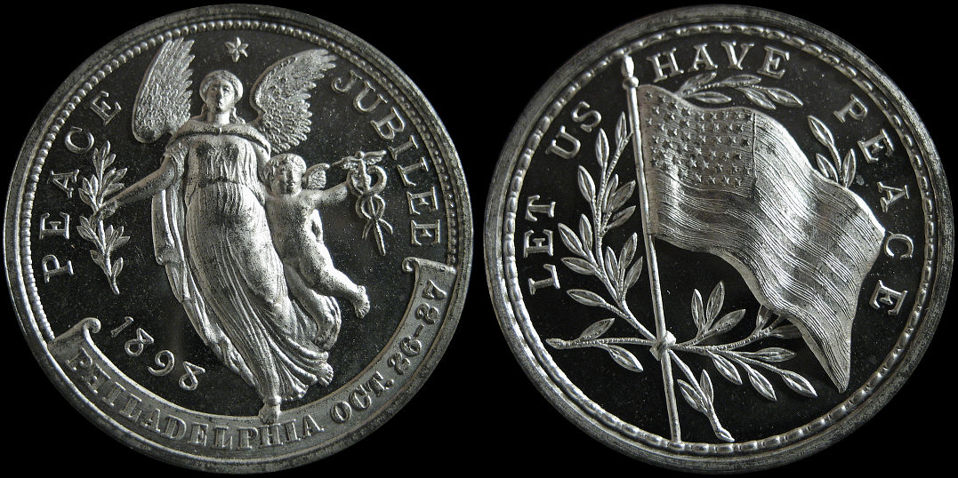 279) Celebrating the end of the Spanish American War. "Peace Jubilee 1898 / Philadelphia Oct. 26-27". In white metal virtually all are holed, sometimes with a hanger. Also exists in bronze. There is also an "Atlanta" variety, probably rarer than the Philadelphia piece shown here, and also extremely rare un-holed. The Philadelphia variety is extremely rare in bronze, rare in white metal, but extremely rare un-holed in white metal. Rulau Phl 75. White metal, 35.1mm. Get 1898 PEACE JUBILEE items on ebay |