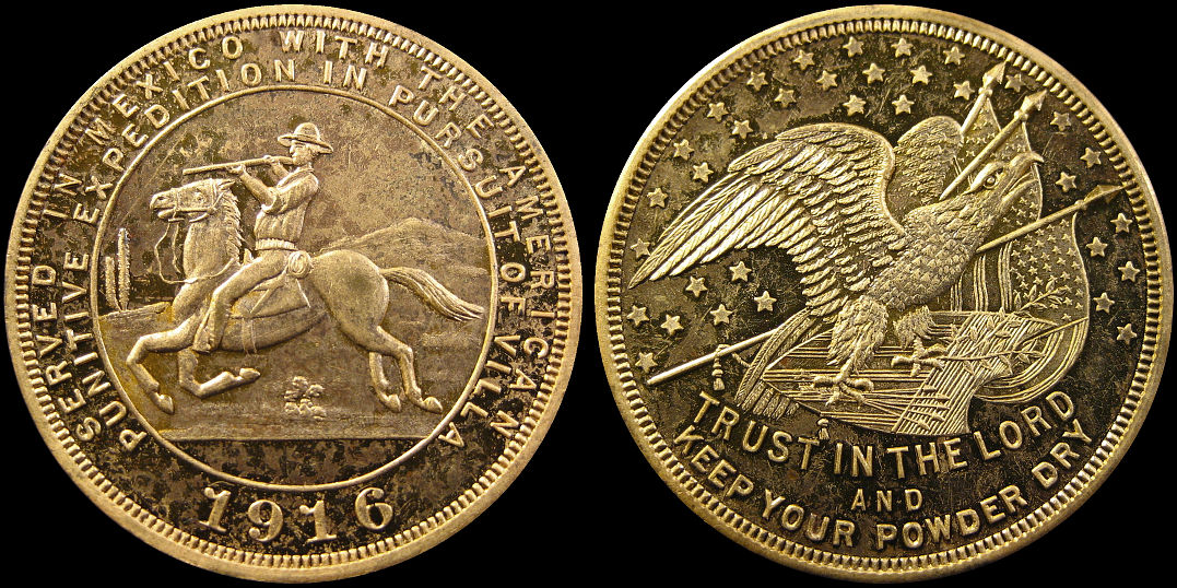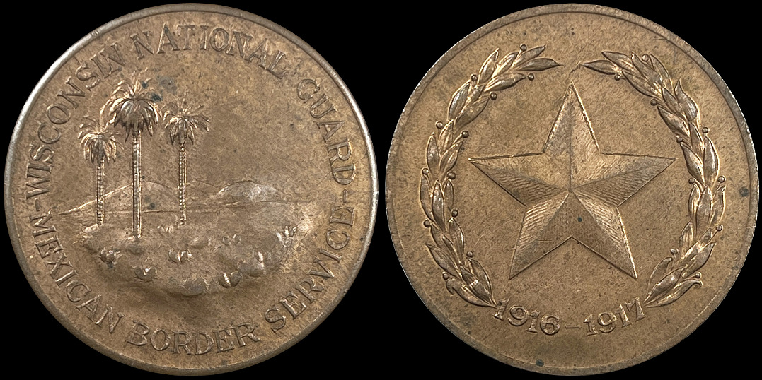 299) "Called To The Colors June 18, 1916 / For Service On The Mexican Border". Has been designated as HK-894C by NGC. I have found this piece described as copper, brass(gilt?) and silvered bronze. All three together, Rare. Bronze, 36mm. Look for MEXICAN BORDER medals on ebay |