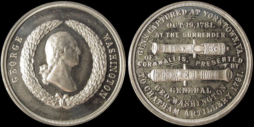 266a) Baker E-452. Commemorating the 1791 presentation of guns to Chatham Artillery by George Washington, captured at the surrender of Cornwallis at the battle of Yorktown ten years earlier. Very rare in bronze and white metal. Also found one example in gilt copper(Kurt Krueger auction #142 lot#2787). Have not located any in silver. Rulau/Fuld only lists in bronze. 44.8mm White Metal. Image Courtesy of Stack’s Bowers Galleries www.stacksbowers.com |