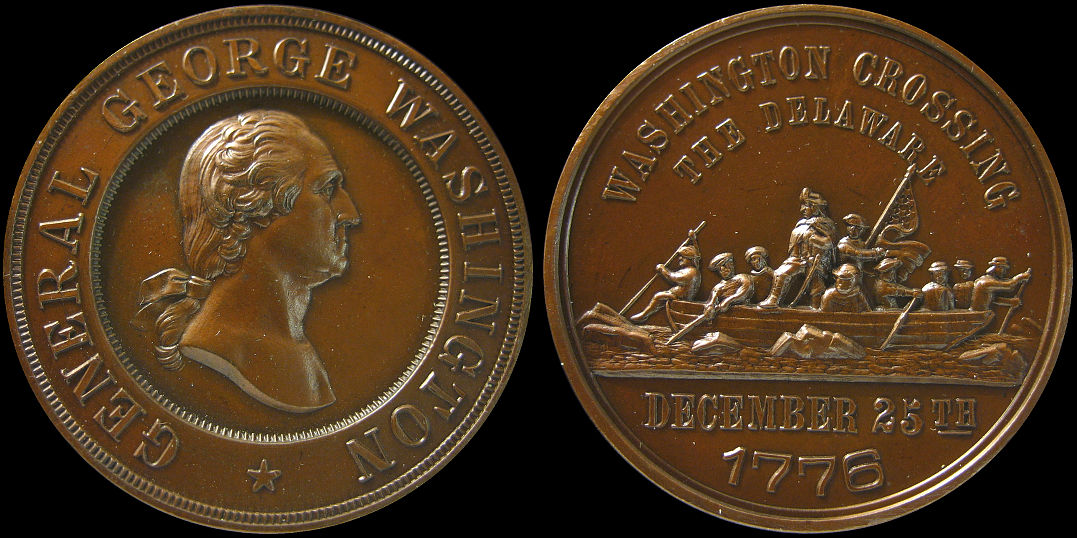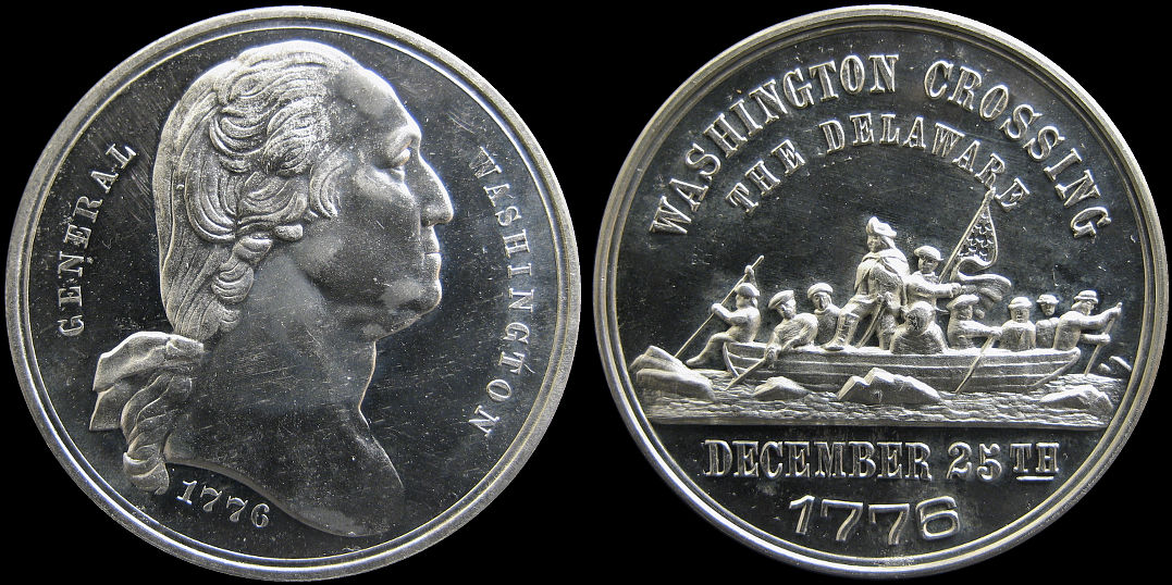 264) "Washington Crossing The Delaware". Not in Rulau/Fuld (Medallic Portraits Of Washington 2nd Edition by Russell Rulau and George Fuld). I have only found it in white metal. Extremely Rare. White metal, 37.7mm. Look at MEDALS OF GEORGE WASHINGTON on ebay |