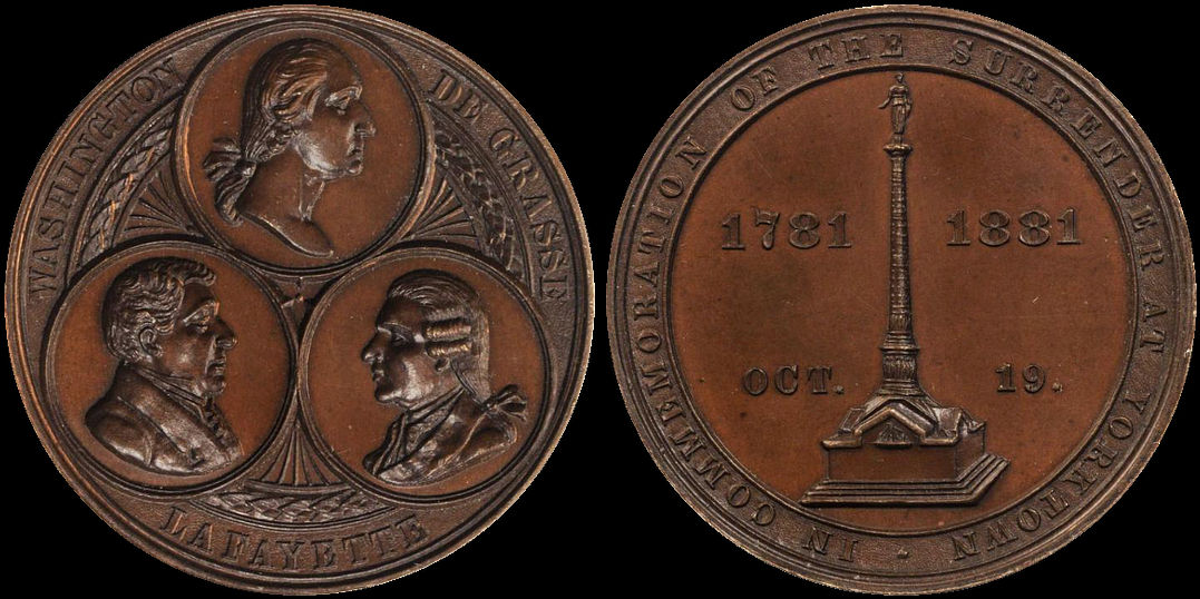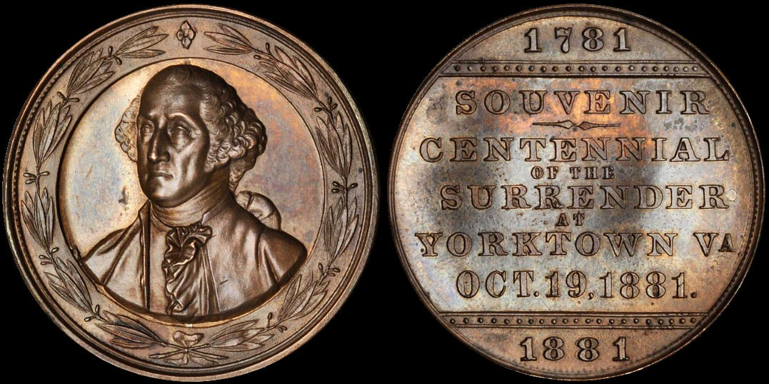270a) Commemorating the 100 year anniversary of the surrender at Yorktown. Found in silver, bronze/copper, and white metal. Rare in white metal and holed half the time. Very rare in copper/bronze, extremely rare in silver. I have usually seen this piece described in auction catalogs as 33mm, not 32 mm as stated in Baker/Rulau/Fuld. Baker 453. Bronze, 33mm. Image Courtesy of Stack’s Bowers Galleries www.stacksbowers.com |
